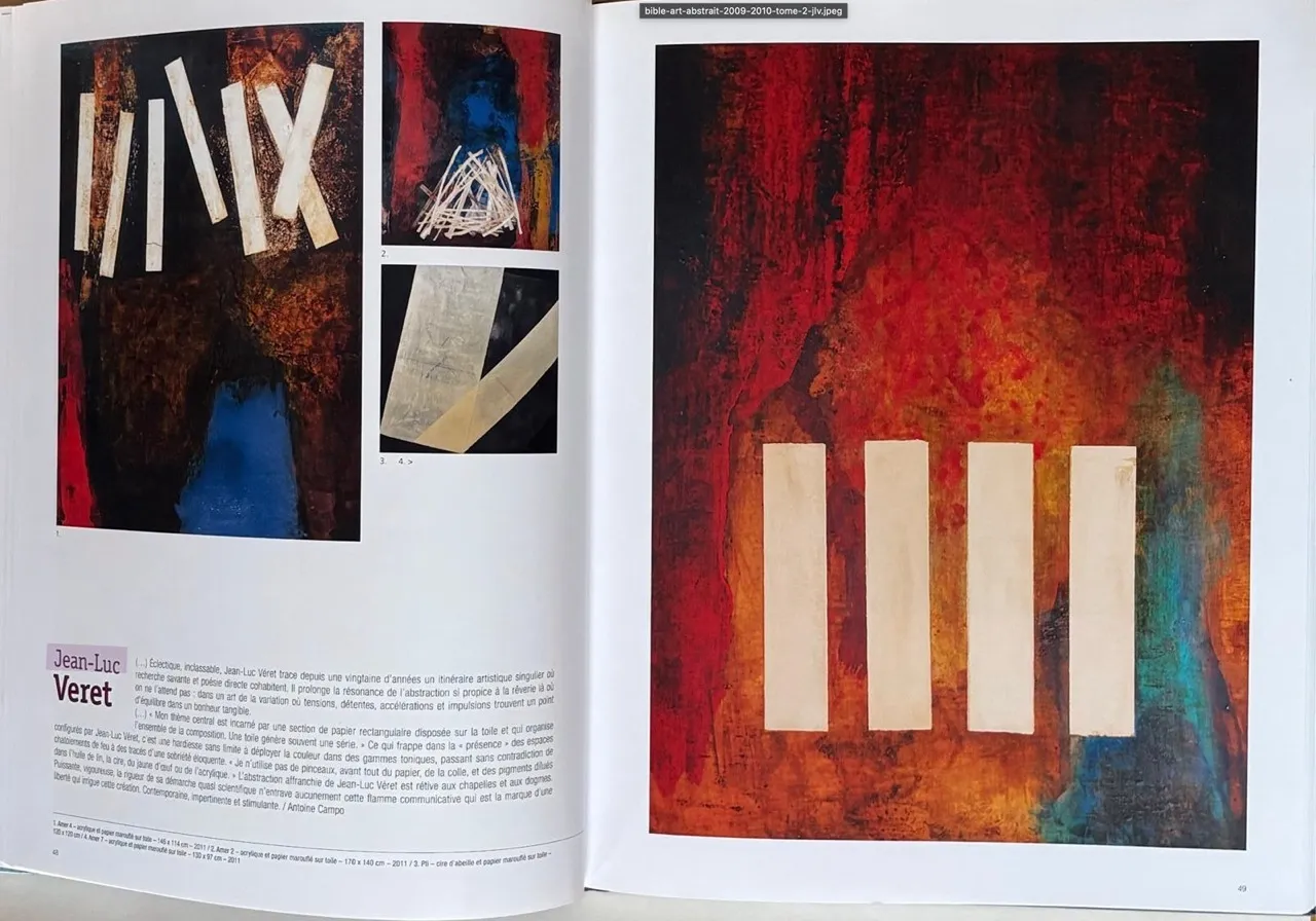 Être publié dans cet ouvrage de référence dédié aux artistes de l’abstraction internationale inscrit Jean-Luc Véret dans une cartographie élargie des pratiques contemporaines, tout en soulignant la singularité de son écriture plastique : une peinture où le geste construit, altère, révèle — et où chaque strate devient le lieu d’un dialogue entre apparition et effacement.